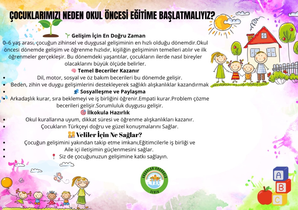Okul öncesi eğitimin çocuğun hayatındaki önemine vurgu yapmak, toplumun okul öncesi eğitime yönelik farkındalığını arttırmak; aile, çocuk ve okul işbirliğini güçlendirmek amacıyla 08 Ekim2025 Çarşamba günü saat 08.00 ile 12:00 saatleri arasında 19 İlçe Milli Eğitim Müdürlüğüne bağlı anasınıfı, ilkokul ve uygulamalı meslek liselerinde eş zamanlı Okul Öncesi Farkındalık Etkinliği yapıldı.